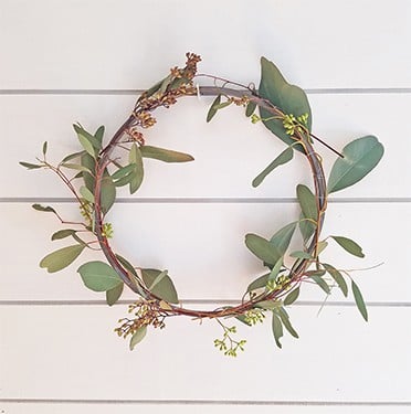 Create a simple, non-traditional floral hoop wreath using faux eucalyptus leaves and pretty pink floral sprigs fastened to a classic gold ring hoop.