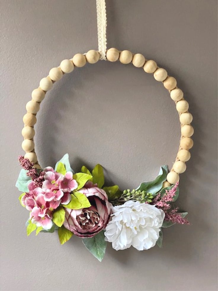 Decorate your home for Spring with a pretty DIY split wood bead floral wreath.